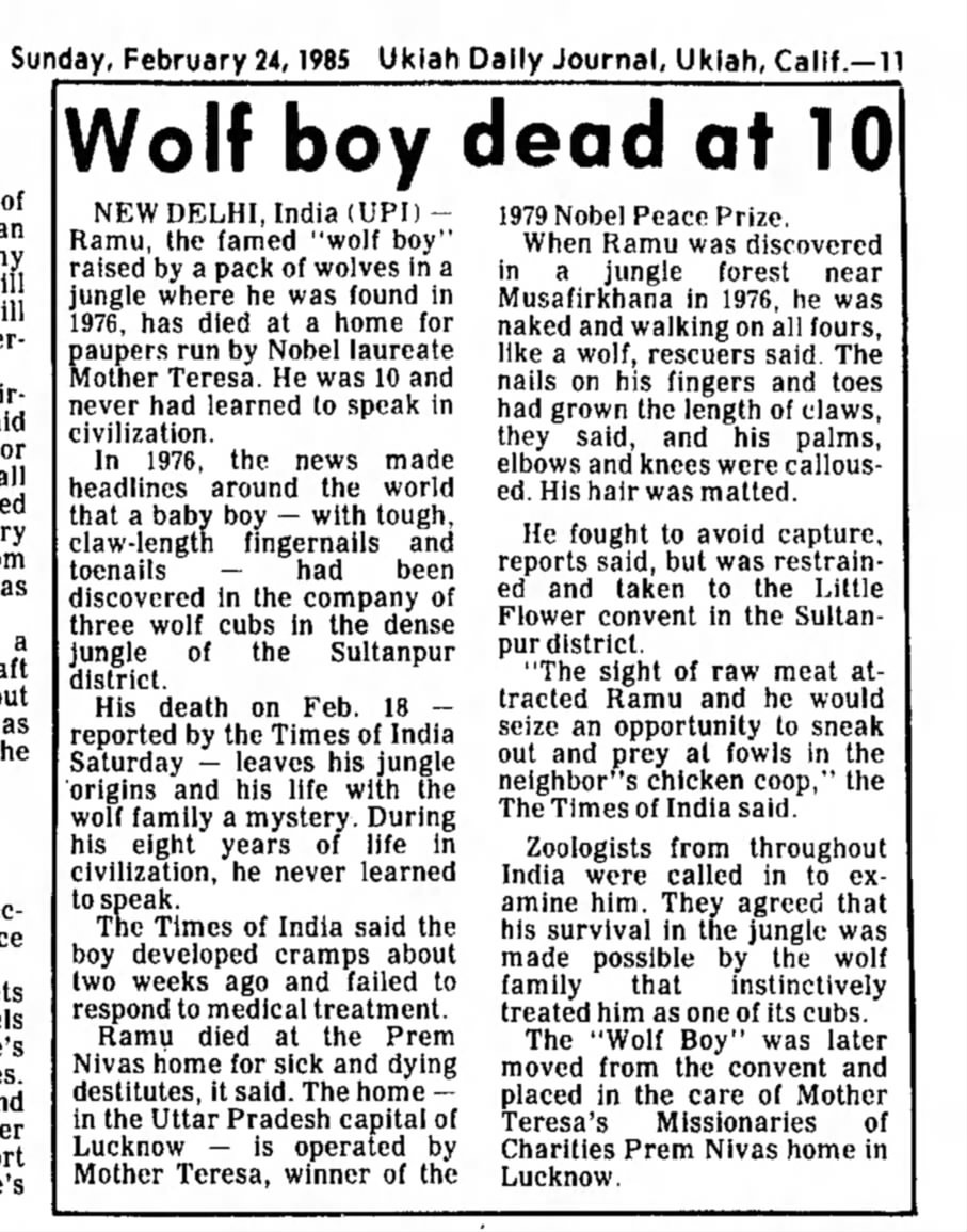In 1954 and 1976, two other wolf boys were discovered in India - exciting global media interest. The latter child was a baby when found and ended up in an orphanage run by Mother Teresa of Calcutta. Shockingly to my view, he died at the age of ten in 1985.